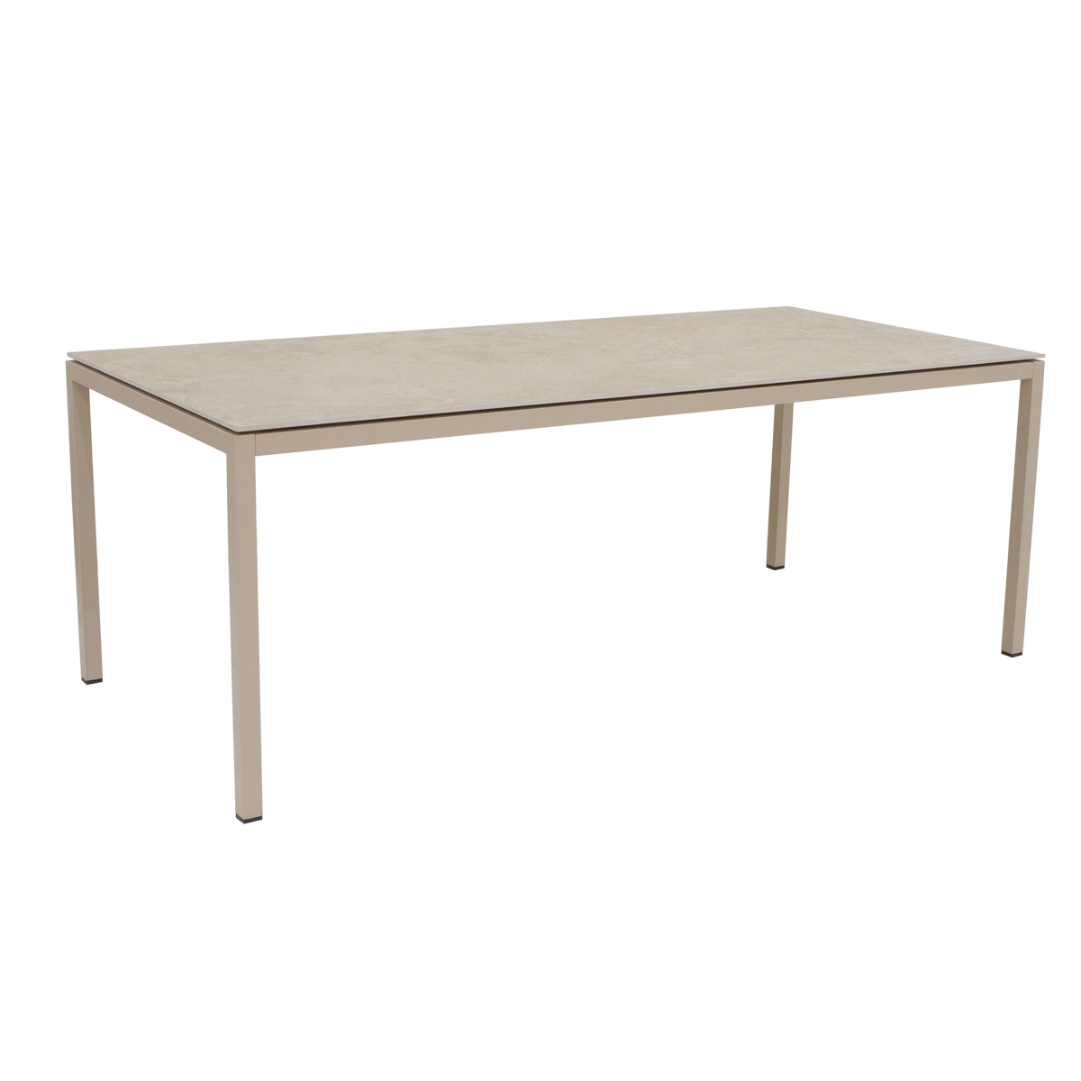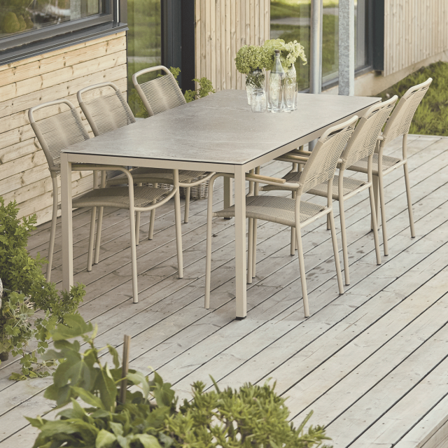 Bordene er fremstillet i pulverlakeret aluminium med stel i den populære taupe-farve og en smuk, meleret keramisk bordplade. Den keramiske overflade giver et blødt og indbydende look – helt uden behov for vedligeholdelse. Ligesom vores velkendte Toscana-borde, så fås Terra i flere længder. Både det mindre på 82 cm med plads til 2-4 personer og 132 cm til 4-6 personer og 197 cm med plads til op til 8 personer. Skal der flere til bords, så har bordene samme bredde, så du kan stille dem i forlængelse af hinanden.