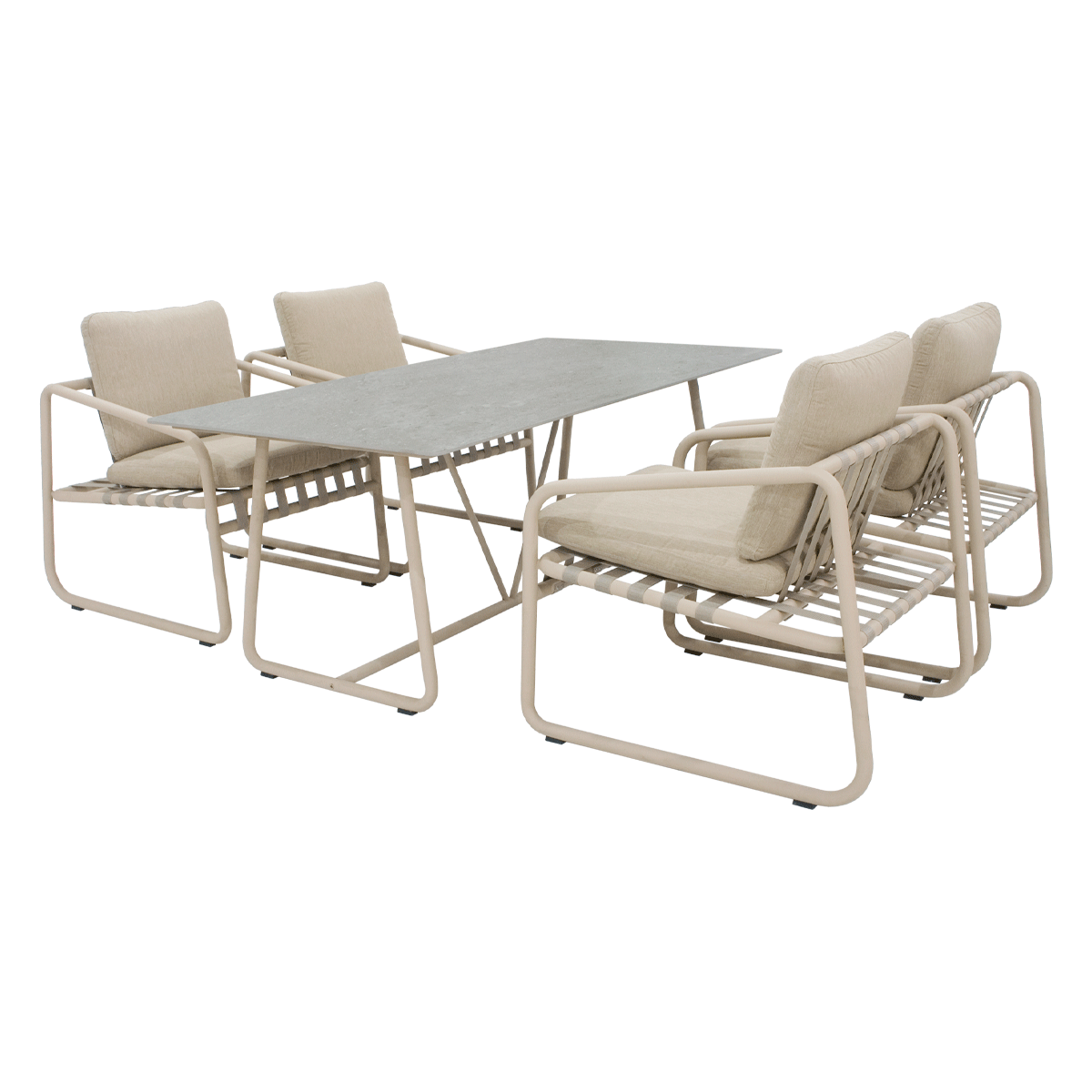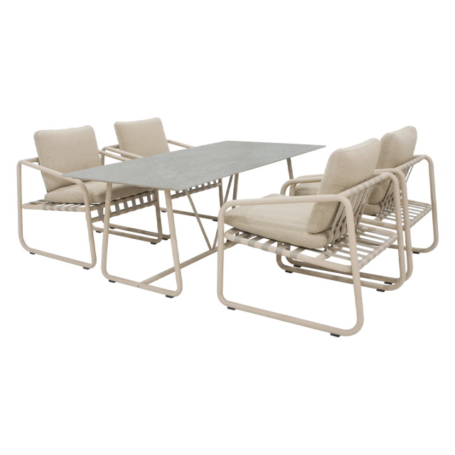 Med Lucca kan du slappe af sammen med familie og venner på terrassen.  Stellet på både stolene og bordet er i pulverlakeret rustfrit stål, og stolenes kraftige gjorde og de komfortable hynder og puder giver både indtrykket af at være robust; have masser af komfort og samtidig et luftigt, blødt og let design. Lucca er skabt i slidstærke materialer, som sikrer, at det kræver minimal vedligeholdelse og rengøring.