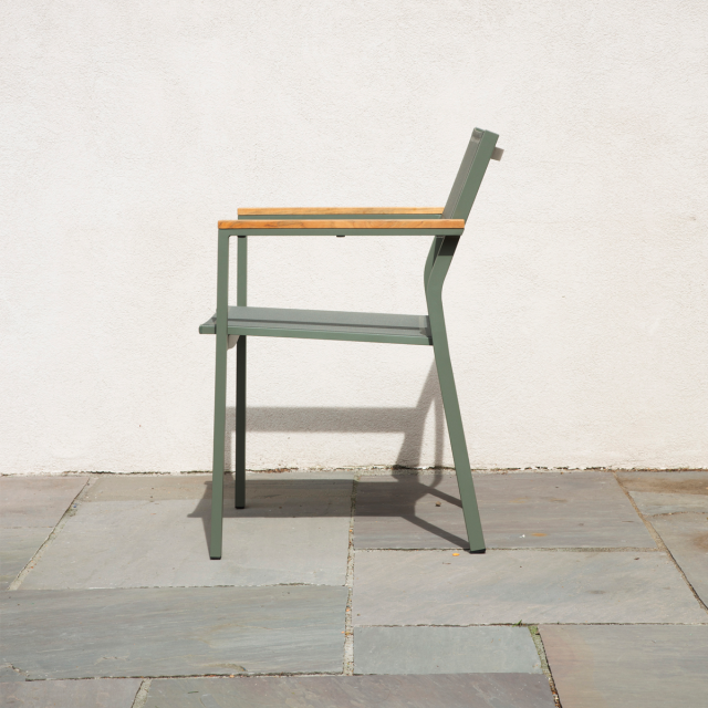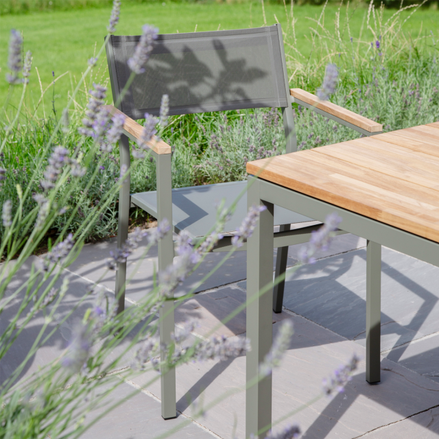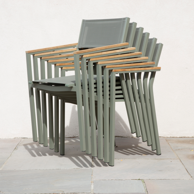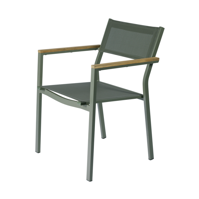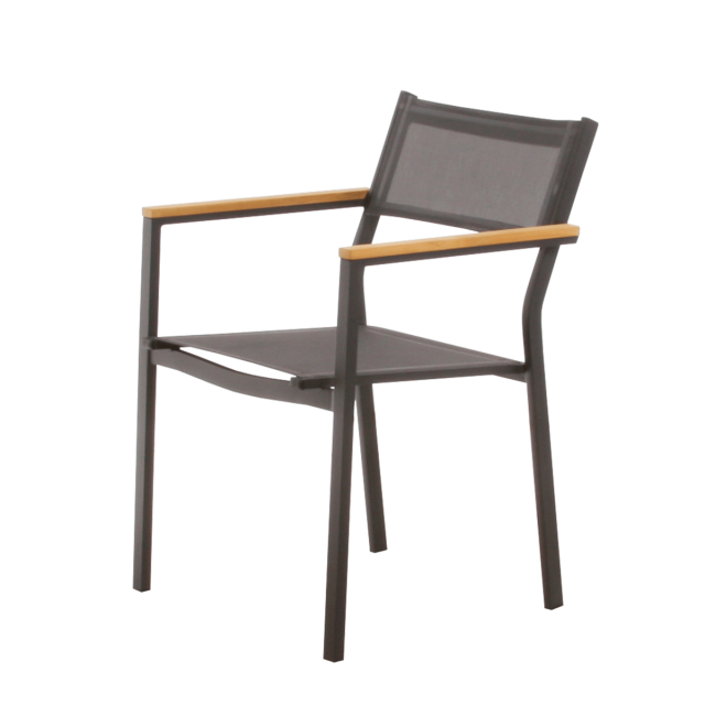 Elba stabelbar havestol i vejrbestandig og UV-behandlet Textilene flet og stel i pulverlakeret aluminium. Armlænet på Elba er selvfølgelig i bæredygtig indonesisk teak.