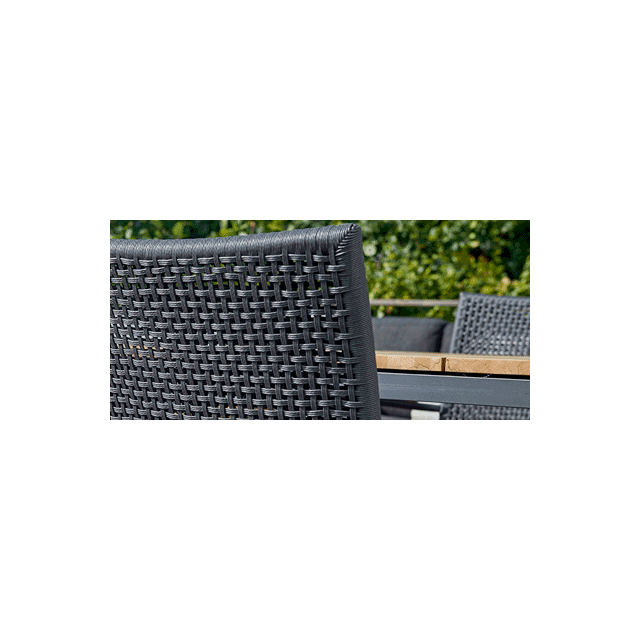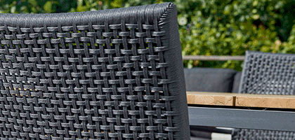 Til alle havestole med flet benytter vi den eksklusive, vedligeholdelsesfri SunLoom fibersnor med en overflade af UV-behandlet plastmateriale og en kærne af 500 polyestertråde. Det giver en både slidstærk og samtidig blød flet, der ikke falmer, ikke knækker og aldrig bliver slap.