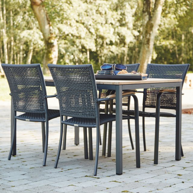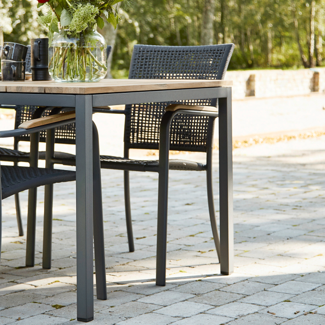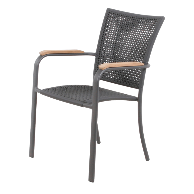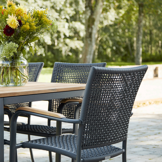 Ravello stabelbar havestol er en af Mandalays store klassikere. Designet tiltaler mange på grund af den gode siddekomfort og det behagelige armlæn i teak. Havestolen er i det vedligeholdelsesfrie SunLoom fiber flet og stel i pulverlakeret aluminium.
