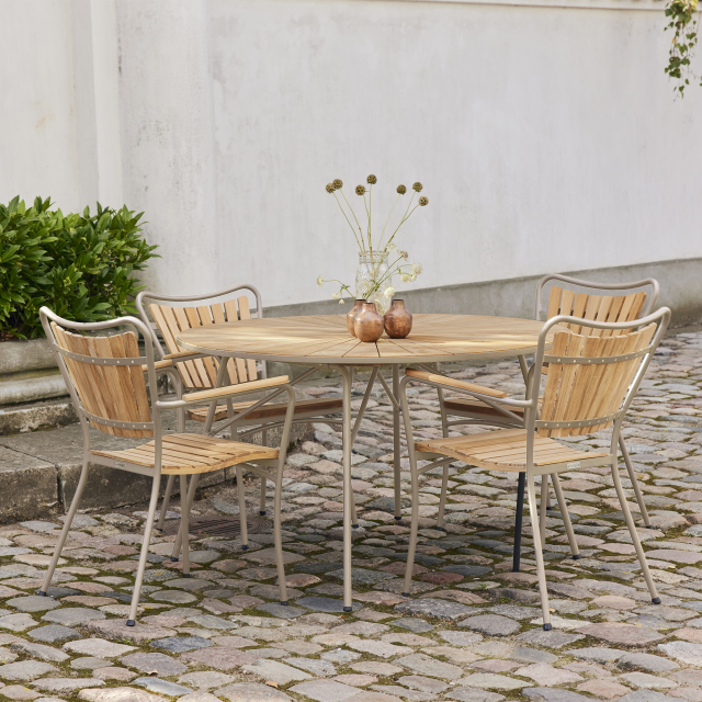 Smukt havebord i den klassiske Marguerit havemøbel-serie, der emmer af dansk havekultur, hygge og begejstring. Med plads til 6 havestole gør havebordet sig perfekt til større sammenkomster, og skaber en elegance på terrassen med dets unikke design. Bordpladen er i massiv indonesisk plantageteak og stellet i rustfrit pulverlakeret aluminium. Bordet er et foldebord, så det let kan stilles væk for vinteren, hvis man ønsker det.