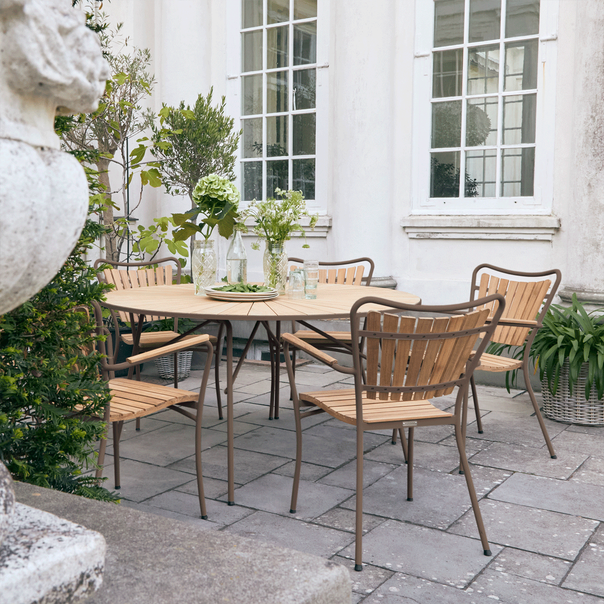 Havebordet er i bæredygtig indonesisk plantageteak og har samme lette udtryk som de øvrige borde i Marguerit-familien. Det kan også foldes, så det optager minimal plads, når det skal opbevares.