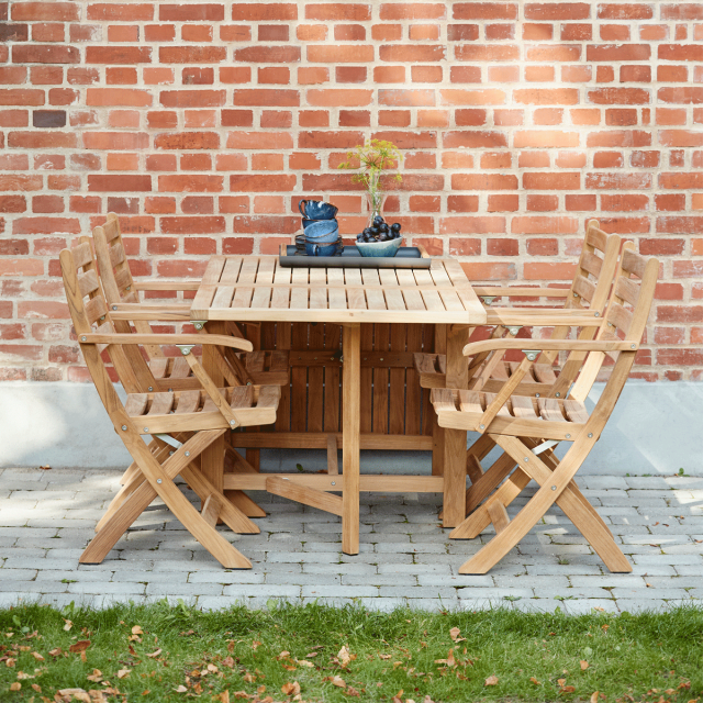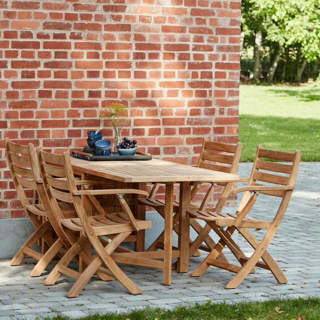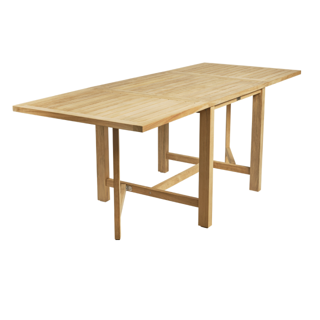 Et klapbord i teaktræ giver dig de bedste betingelser for at spare plads. Det er især en fordel i den lille have eller på den lille terrasse. Er I kun to personer til hverdag, kan klapperne i begge sider klappes ned, så bordet ikke optager unødigt plads. Klapperne er fastmonterede.